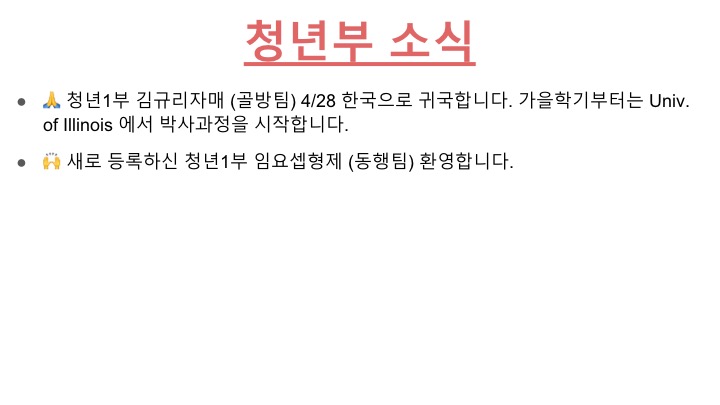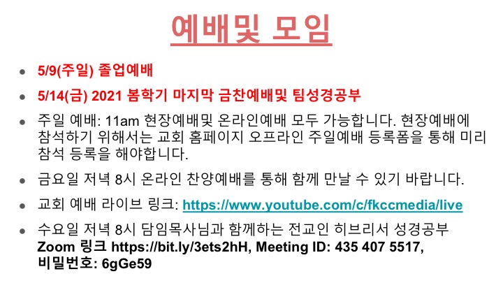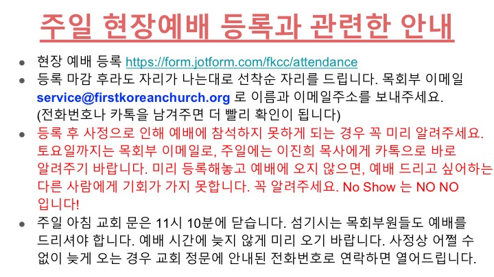 내일은 주일입니다. 온라인 혹은 현장예배에 꼭 참석하시기 바랍니다.