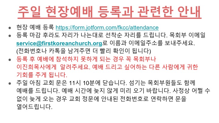 내일은 주일입니다. 온라인이나 현장예배를 꼭 드리시기 바랍니다.