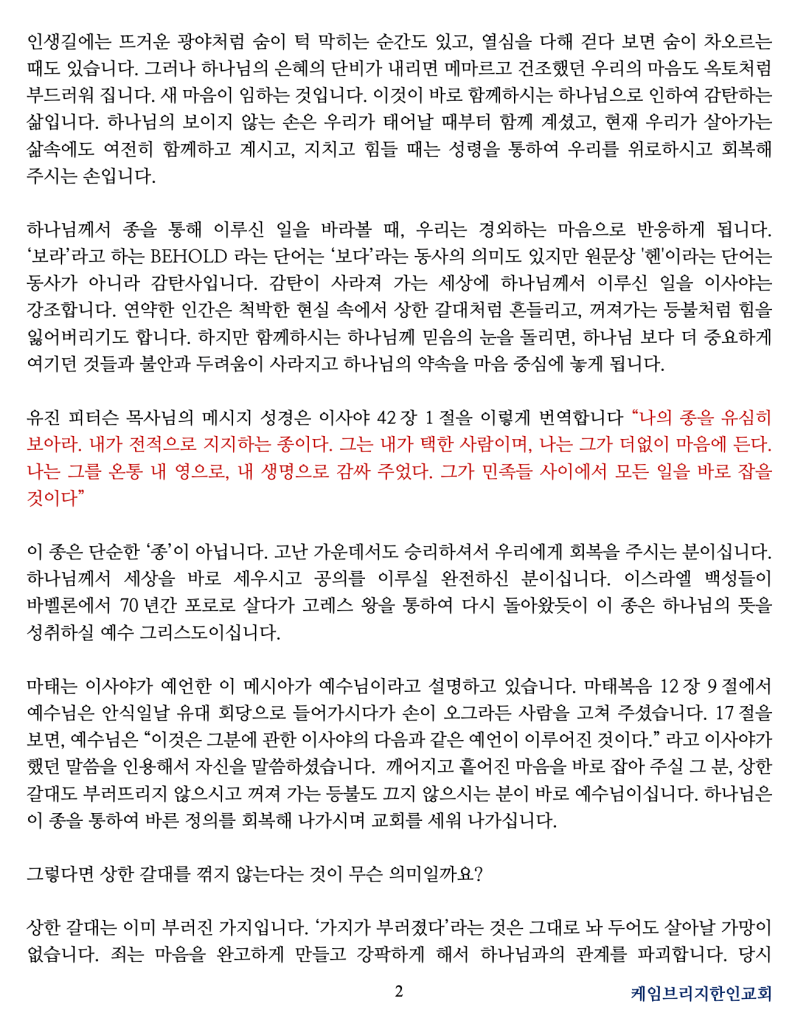 비록 나의 기도가 응답 되지 않고 내 삶이 부족하게 느껴진다고 해도, 하나님께 쓰임 받고 있다는 확신이 있다면 끝까지 믿음의 길을 선택하는 것입니다. 죽음을 이기신 주님께서는 우리의 마음 안에 거하시며 참된 생명으로 우리를 붙들어 주실 것입니다.