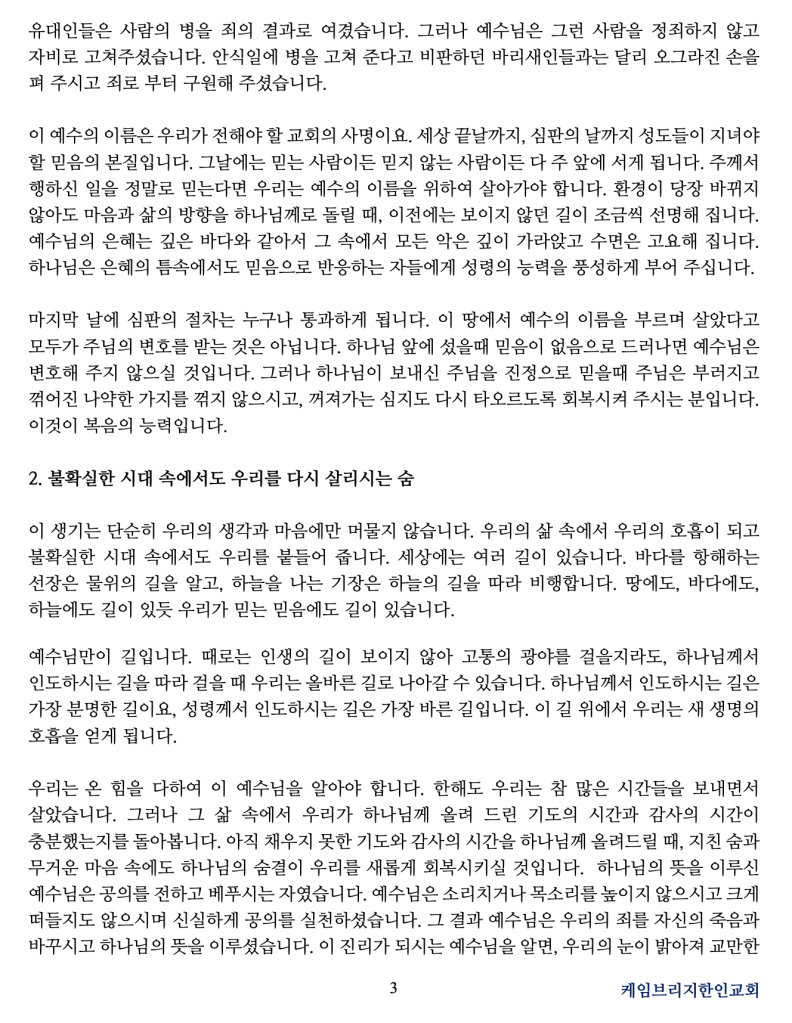 이 믿음의 고백은 우리가 함께 믿고 걸어야 할 길입니다. 하나님의 사랑이 우리로 하여금 섬김의 자리로 한 걸음씩 나아가게 합니다. 이제 우리 교회도 50주년을 향해 나아갑니다. 하나님께 맡기신 시대적 사명을 감당하는 교회가 되어야 합니다. 한 사람 한 사람이 예수 그리스도의 제자로 살아가며 하나님께 쓰임받는 사명자로 세워져야 합니다. 맡겨진 사명을 감당하는 자들에게 하나님은 더 큰 믿음을 허락해 주십니다.