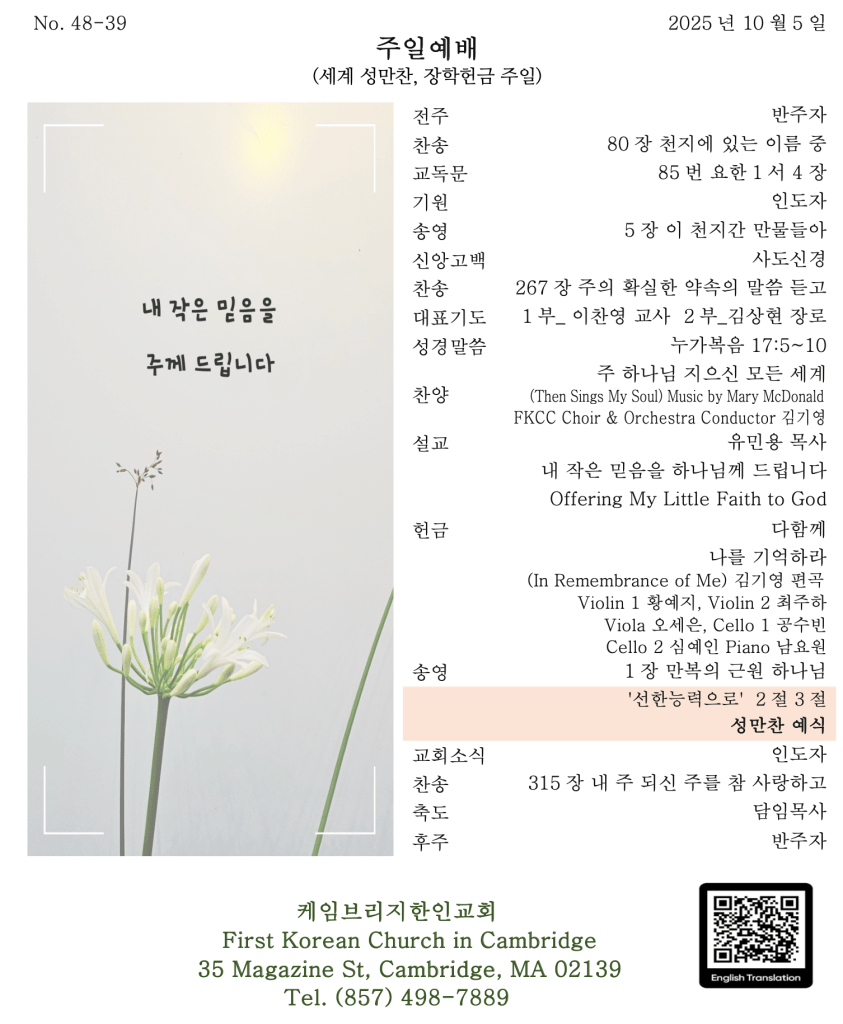오늘은 세계 성만찬 주일입니다. 이 성찬을 통해 예수님께서 우리를 위해 내어주신 사랑을 기억하게 됩니다. 우리의 믿음은 작고 연약하지만 성찬의 믿음을 통해서 서로의 삶의 고단함을 위로해 주고, 하나님과의 관계가 더 깊어지길 소망합니다.