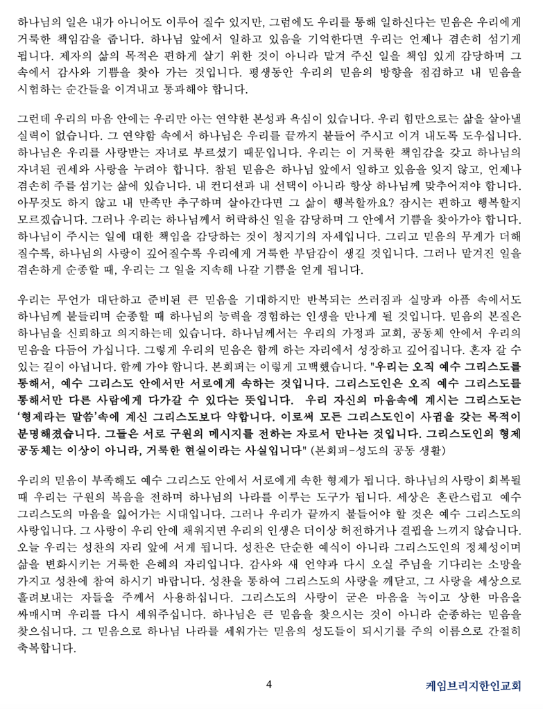 케임브리지한인교회는 건물이 아닙니다. 바로 여러분 자신들이 케임브리지한인교회입니다. 여러분 한 사람 한 사람에 의해 케임브리지한인교회가 어떤 교회인지 정체성(identity)이 결 정됩니다. 저는 우리 교회가 이런 교회가 되었으면 좋겠습니다. 주일마다 교회에 모여 예배 를 통해 새롭게 창조되는 교회, 그리고, 주변의 고통받는 사람들을 외면하지 않는 교회, 환 난과 고난을 오히려 성장의 기회로 삼아 더욱 단단해지는 교회, 그리고 세상으로 들어가서 각자의 위치에서 조용히 섬김의 삶을 통하여 그리스도의 남은 고난을 채워가는 교회가 되는 것입니다. 이런 교회가 되기 위해서는 이 두 가지 질문을 끊임없이 던지고 그 질문에 답해 야 합니다. “이 시대에 크리스천으로 산다는 것은 무엇을 의미하는가?” 그리고 “우리 교회의 시대적인 사명은 무엇이며, 그것을 어떻게 감당해야 하는가?”