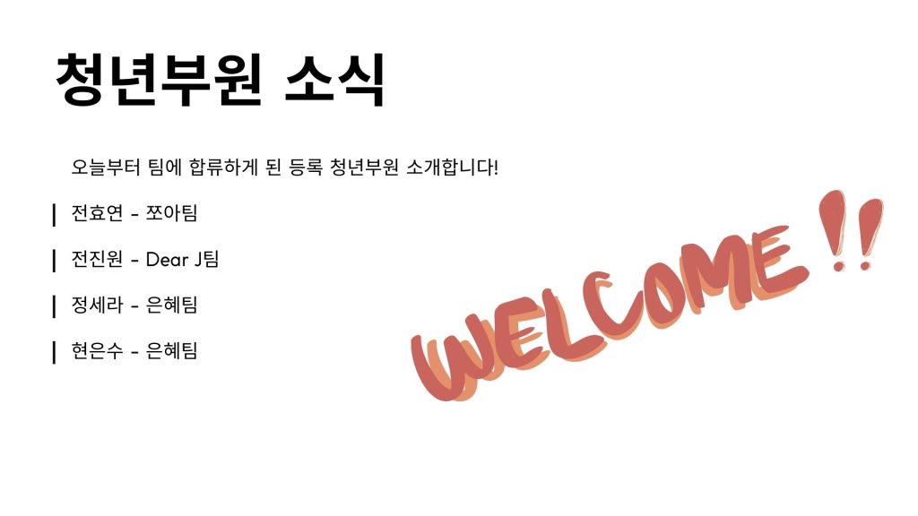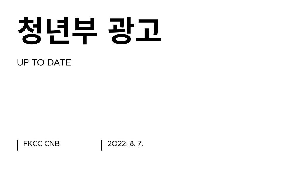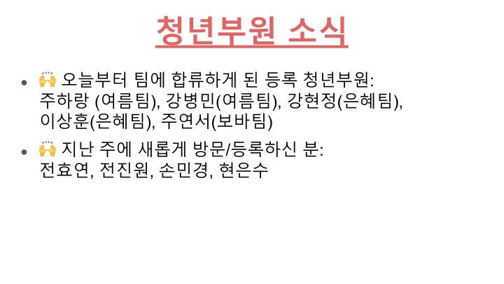모쪼록 저희 청년부 공동체를 통해 청년 각자가 예수 그리스도의 복음의 놀라운 소식을 개인적으로 깊이 체험하고, 예수를 더욱 알아가며, 각자의 삶의 터전에서 예수를 닮아가는 삶으로 성장해 나가기를 소망합니다.