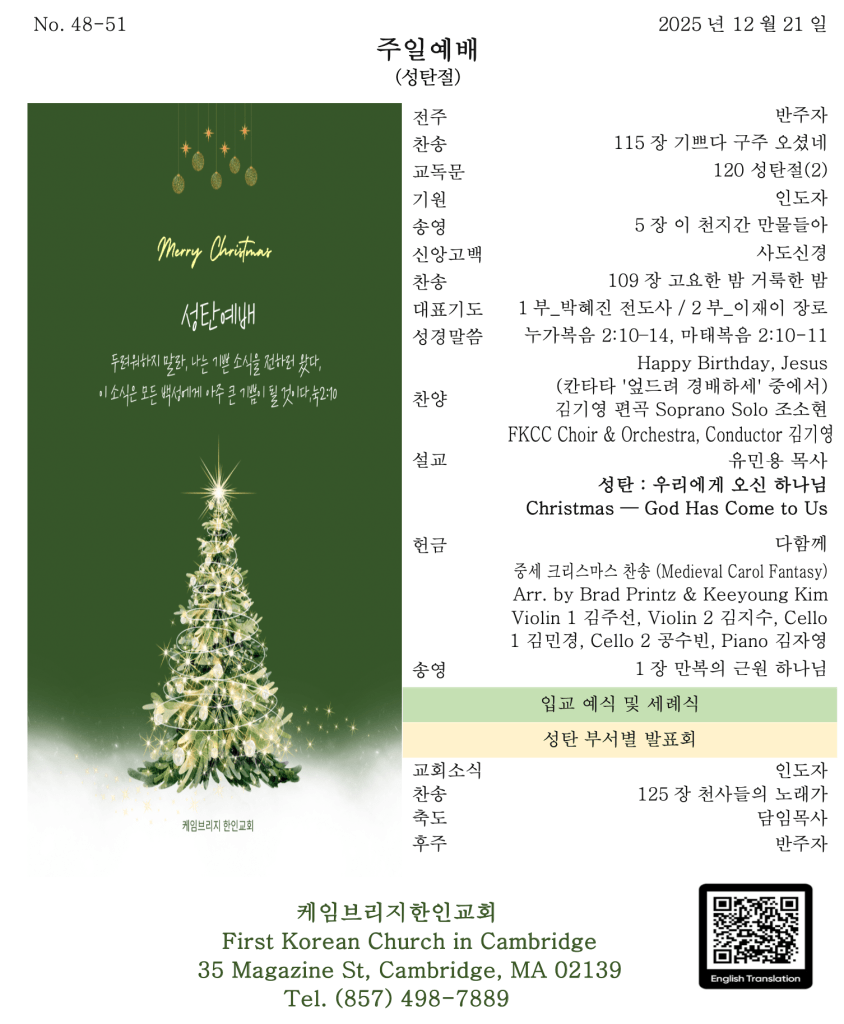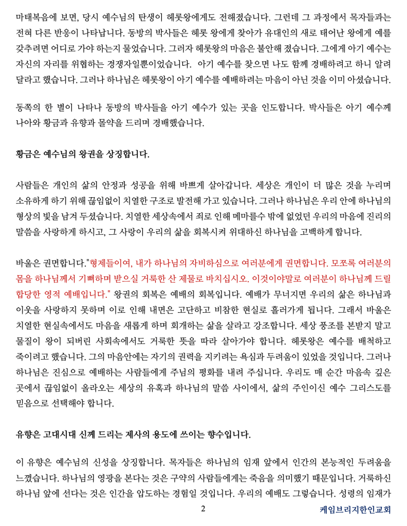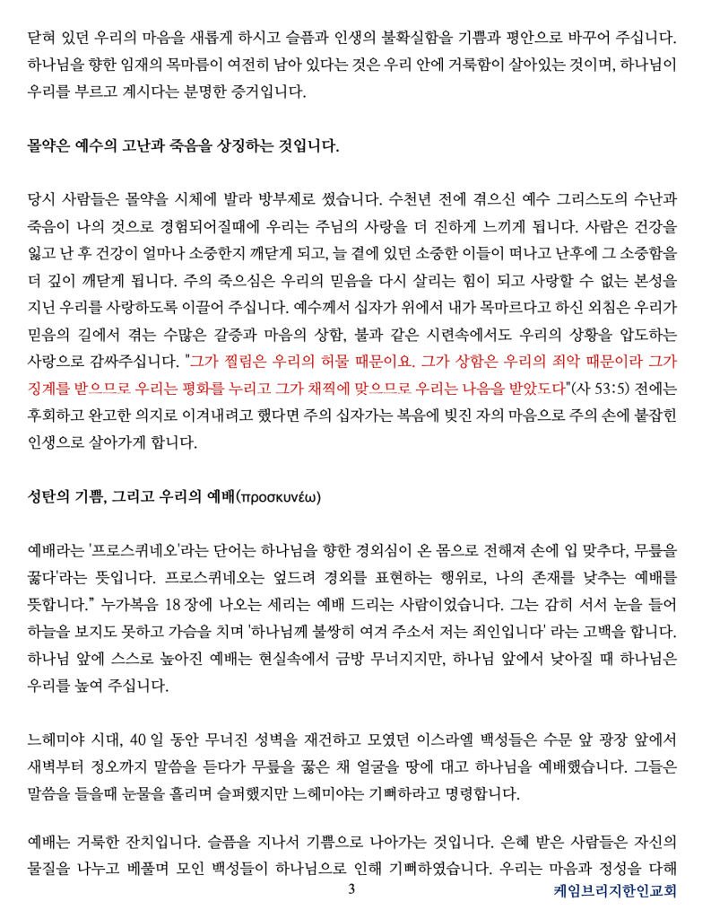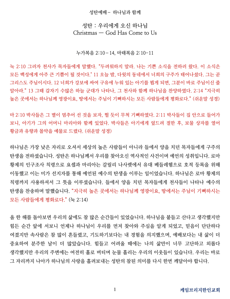 올 한 해를 돌아보면 우리의 삶에도 참 많은 순간들이 있었습니다. 하나님을 붙들고 산다고 생각했지만 힘든 순간 앞에 서보니 언제나 하나님이 우리를 먼저 찾아와 주심을 알게 되었고, 믿음이 단단하다 여겼지만 속사람은 참 많이 흔들렸고, 기도하기보다는 내 경험을 의지했으며, 예배보다는 내 삶이 더 중요하여 분주한 날이 더 많았습니다. 힘들고 어려울 때에는 나의 삶만이 너무 고단하고 외롭다 생각했지만 우리의 주변에는 여전히 홀로 버티며 눈물 흘리는 우리의 이웃들이 있습니다. 우리는 바로 그 자리까지 나아가 하나님의 사랑을 흘려보내는 성탄의 참된 의미를 다시 한번 깨달아야 합니다.