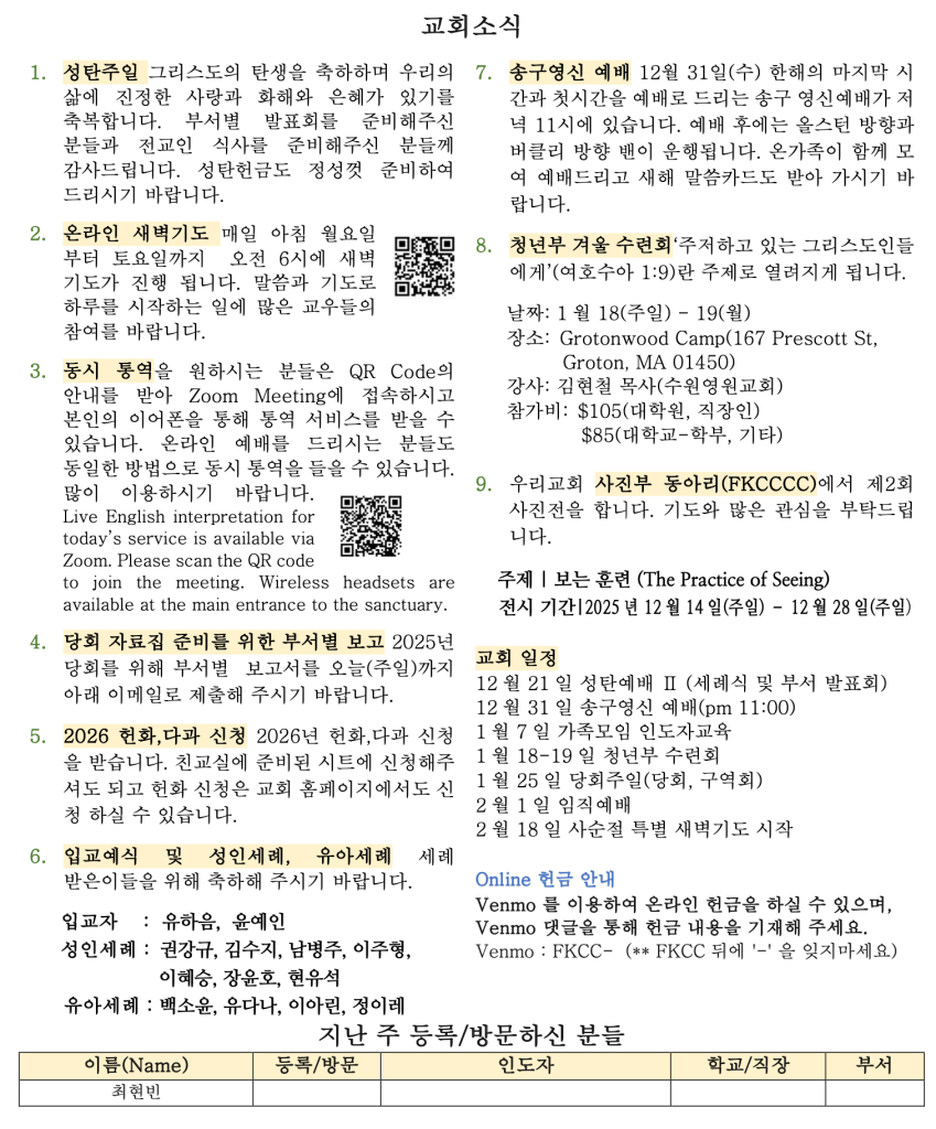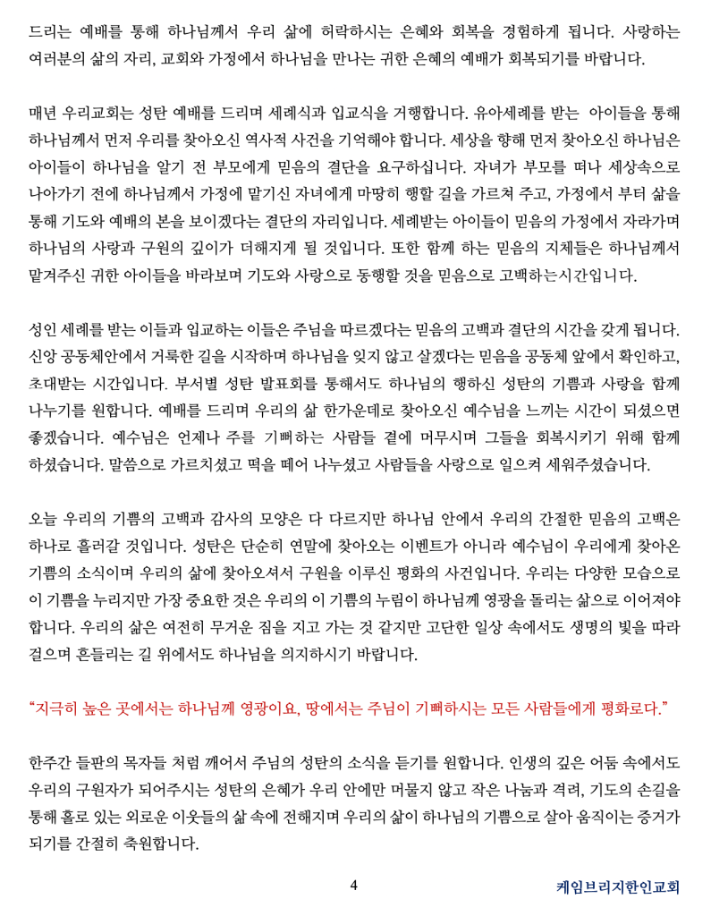 한주간 들판의 목자들 처럼 깨어서 주님의 성탄의 소식을 듣기를 원합니다. 인생의 깊은 어둠 속에서도 우리의 구원자가 되어주시는 성탄의 은혜가 우리 안에만 머물지 않고 작은 나눔과 격려, 기도의 손길을 통해 홀로 있는 외로운 이웃들의 삶 속에 전해지며 우리의 삶이 하나님의 기쁨으로 살아 움직이는 증거가 되기를 간절히 축원합니다.