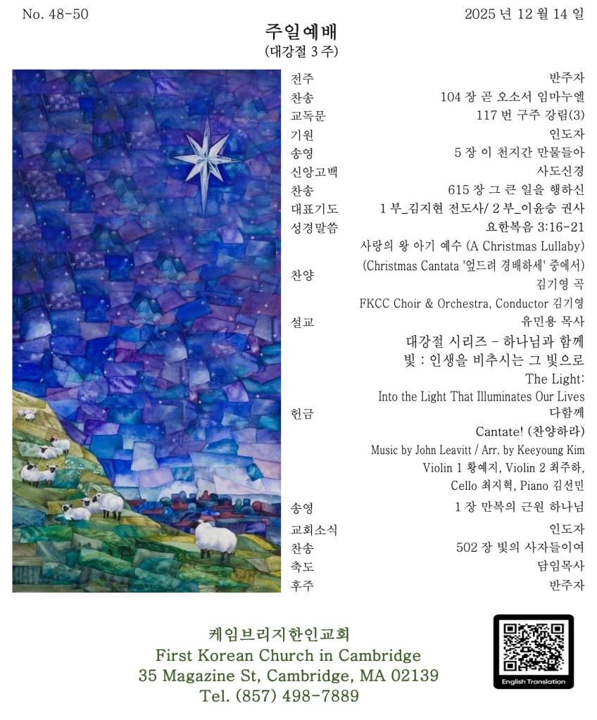 그러나 하나님은 눈물이 닿는 그 곳에, 조용히 멈추어 있는 기도의 자리에, 말로 다 할 수 없는 한숨 속에도 우리와 함께 하십니다. 교회가 세상과 다를 수밖에 없는 이유는, 같은 현실을 보면서도 그 안에서 하나님을 바라보기 때문입니다. 하나님이 세상을 극진히 사랑하셔서 누구든지 그 아들을 믿는 자마다 멸망하지 않고 영원한 생명을 얻게 하신다는 말씀은 하나님 사랑의 일방적인 선언입니다. 오늘 우리 앞에 대강절 세번째 촛불이 켜졌습니다. 이 빛은 단지 상징이 아니라 바로 예수 그리스도입니다. 빛은 이미 우리에게 왔습니다. 이제 우리는 이 빛을 발견하는데 멈추지 않고, 그 빛을 드러내며 살아야 합니다. 이 빛이 우리의 삶을 비추고 있음을 기억하시기 바랍니다. 우리의 삶이, 우리의 고백이, 우리의 작은 마음이 사람을 살리는 빛이 되도록 살아가야 합니다. 깨어지고 부서진 깊은 고독의 자리에서도 이 빛은 결코 꺼지지 않습니다. 여러분 한 사람 한 사람이 그 빛을 지닌 자녀들입니다. 넉넉한 사랑의 품으로 가정과 일터, 학업의 현장으로 나아가시기 바랍니다. 여러분이 받은 빛으로 주변을 환하게 밝혀 주시기 바랍니다. 깊은 어둠 속에서도 꺼지지 않는 불꽃처럼, 흔들림 속에서도 무너지지 않는 반석처럼, 이 세상이 전부가 아님을 믿는 성도들의 삶을 통해 살아 역사하시는 진리의 빛이 드러나게 될 것입니다.