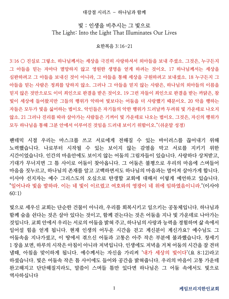 빛으로 세우신 교회는 단순한 건물이 아니라, 우리를 회복시키고 일으키는 공동체입니다. 하나님과 함께 숨을 쉰다는 것은 살아 있다는 것이고, 함께 걷는다는 것은 어둠을 지나 빛 가운데로 나아가는 것입니다. 교회 안에서 우리는 서로의 어둠을 밝혀 주고, 하나님의 사랑과 능력을 경험하며 삶 속에서 일어설 힘을 얻게 됩니다. 현재 인생의 어두운 시간을 걷고 계신분이 계신가요? 예수님도 그 어둠속을 지나가셨고, 이 땅에서 겪으신 어둠과 고통은 아주 작은 부분에 불과했습니다. 창세기 1장을 보면, 하루의 시작은 아침이 아니라 저녁입니다. 인생에도 저녁을 거쳐 어둠의 시간을 잘 견뎌 낼때, 아침을 맞이하게 됩니다. 예수께서는 자신을 가리켜 ‘내가 세상의 빛이다’(요 8:12)라고 하셨습니다. 빛은 어둠속 작은 틈 사이에도 들어와 공간을 밝혀줍니다. 우리의 마음이 고통 가운데 완고해지고 단단해질지라도, 말씀이 스며들 틈만 있다면 하나님은 그 어둠 속에서도 빛으로 역사하십니다