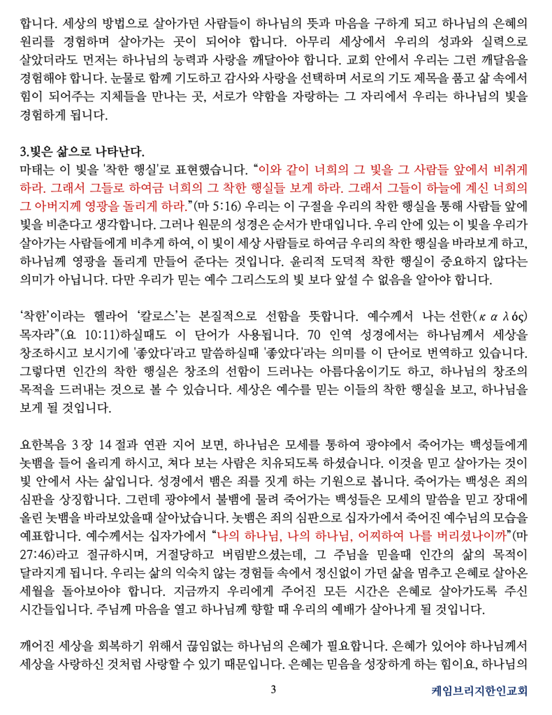 마태는 이 빛을 ‘착한 행실’로 표현했습니다. “이와 같이 너희의 그 빛을 그 사람들 앞에서 비취게 하라. 그래서 그들로 하여금 너희의 그 착한 행실들 보게 하라. 그래서 그들이 하늘에 계신 너희의 그 아버지께 영광을 돌리게 하라.”(마 5:16) 우리는 이 구절을 우리의 착한 행실을 통해 사람들 앞에 빛을 비춘다고 생각합니다. 그러나 원문의 성경은 순서가 반대입니다. 우리 안에 있는 이 빛을 우리가 살아가는 사람들에게 비추게 하여, 이 빛이 세상 사람들로 하여금 우리의 착한 행실을 바라보게 하고, 하나님께 영광을 돌리게 만들어 준다는 것입니다. 윤리적 도덕적 착한 행실이 중요하지 않다는 의미가 아닙니다. 다만 우리가 믿는 예수 그리스도의 빛 보다 앞설 수 없음을 알아야 합니다.