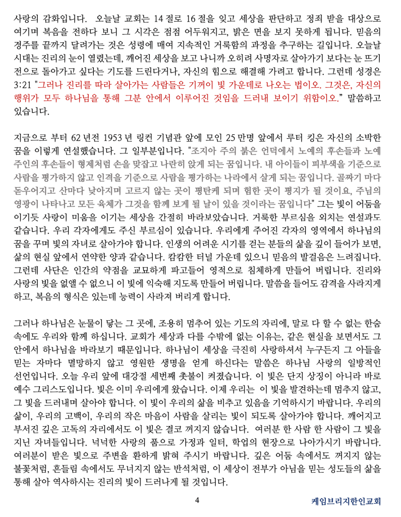 지금으로 부터 62년전 1953년 링컨 기념관 앞에 모인 25만명 앞에서 루터 킹은 자신의 소박한 꿈을 이렇게 연설했습니다. 그 일부분입니다. “조지아 주의 붉은 언덕에서 노예의 후손들과 노예 주인의 후손들이 형제처럼 손을 맞잡고 나란히 앉게 되는 꿈입니다. 내 아이들이 피부색을 기준으로 사람을 평가하지 않고 인격을 기준으로 사람을 평가하는 나라에서 살게 되는 꿈입니다. 골짜기 마다 돋우어지고 산마다 낮아지며 고르지 않는 곳이 평탄케 되며 험한 곳이 평지가 될 것이요, 주님의 영광이 나타나고 모든 육체가 그것을 함께 보게 될 날이 있을 것이라는 꿈입니다” 그는 빛이 어둠을 이기듯 사랑이 미움을 이기는 세상을 간절히 바라보았습니다. 거룩한 부르심을 외치는 연설과도 같습니다. 우리 각자에게도 주신 부르심이 있습니다. 우리에게 주어진 각자의 영역에서 하나님의 꿈을 꾸며 빛의 자녀로 살아가야 합니다. 인생의 어려운 시기를 걷는 분들의 삶을 깊이 들어가 보면, 삶의 현실 앞에서 연약한 양과 같습니다. 캄캄한 터널 가운데 있으니 믿음의 발걸음은 느려집니다. 그런데 사단은 인간의 약점을 교묘하게 파고들어 영적으로 침체하게 만들어 버립니다. 진리와 사랑의 빛을 없앨 수 없으니 이 빛에 익숙해 지도록 만들어 버립니다. 말씀을 들어도 감격을 사라지게 하고, 복음의 형식은 있는데 능력이 사라져 버리게 합니다.